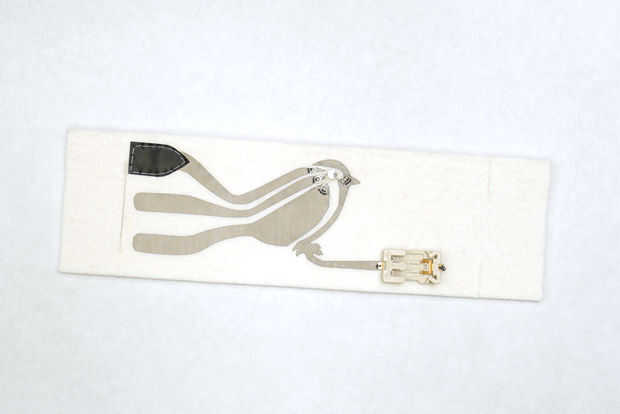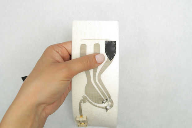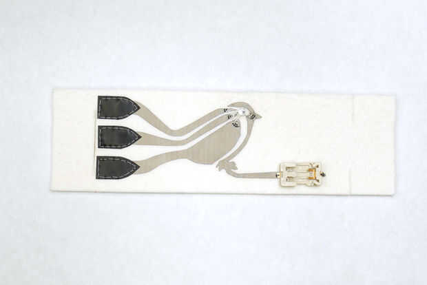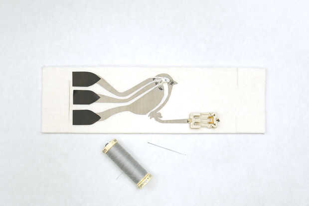 Teniendo esto en cuenta, pone la Velostat sobre los rastros conductores, que cubre los extremos de las plumas de la cola de pájaro. En su lugar con cinta y poner la pulsera juntos para poner a prueba una vez más que los rastros de la parte inferior y superior no toquen entre sí, excepto a través del contacto con el plástico.