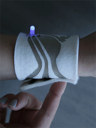 Este proyecto intercambia piezas de metal duras para metalizado suave tela y el hilo. Normalmente los alambres de cobre o rastros metal pantalla impresa en una placa de circuito conectan todos los componentes. El metal es conductor, permite electricidad fluya de la batería el LED, haciendo que se encienda para arriba. En vez del alambre, este proyecto utiliza la tela conductora. Las conexiones en un circuito entre el alambre y los componentes se hacen por soldadura con aleaciones de metales. En lugar de utilizar la soldadura, vamos a hacer estas conexiones por coser con hilo conductor.