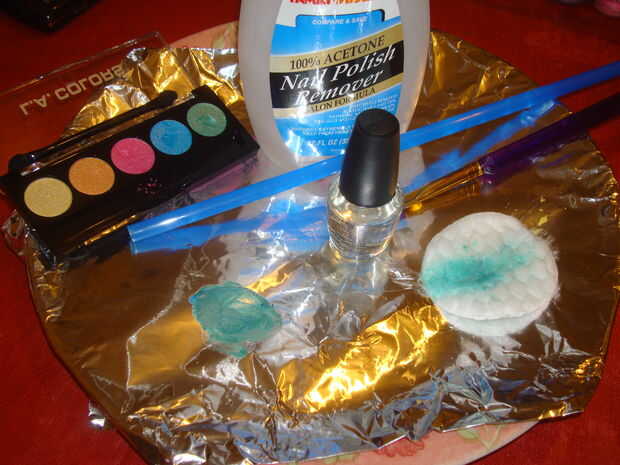 Uso de la paja; sacar con pala encima de una pequeña cantidad de la sombra de ojos y poner encima el esmalte de uñas.