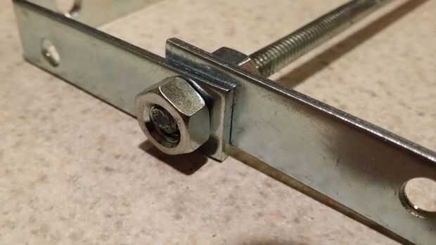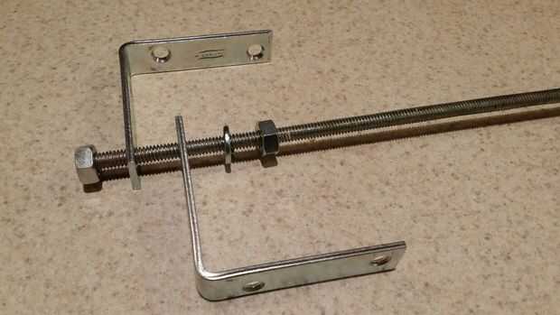 En primer lugar, coloque una tuerca, luego la arandela, luego las dos escuadras y luego la segunda tuerca. Asegúrese de que los soportes de ángulo se oponen entre sí y que la varilla roscada a través de los orificios de las escuadras que ponen más lejos aparte (como en las fotos).