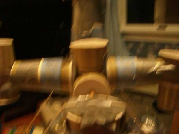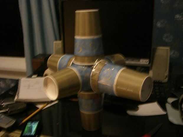 Primero dos taza de café y la tallas grandes juntas y la cinta alrededor del centro. luego tome otras cuatro tazas y coloque los tamaños grandes alrededor del anillo central para que coincida con el cuadro. cinta adhesiva hacia abajo firmemente para mantener en su lugar. Tome un lápiz y haga un orificio grande que bastante para el pasador en el centro de las dos tazas de café del centro. introducir la espiga en las tazas y asegúrese de que puede girar libremente alrededor de su centro. Tomar cuatro tazas de otro y las formas laterales en las tazas de café de cuatro haciendo que los rayos del eje de la cinta. Asegúrese de que todos señalan la misma manera para coger el café. el siguiente paso es hacer una taza de café a un tercio de su tamaño. luego cinta adhesiva en el centro del paralelo rueda a uno de los radios. luego tomar un trozo de cartón o cualquier pieza de similar peso objeto y cinta boca abajo en el mismo lado del eje. Esto actúa como un contrapeso y mantiene la rueda en su lugar manteniendo la crema dentro de la taza hasta que el café se vierte en él.