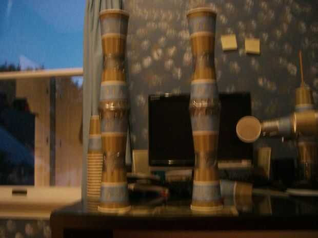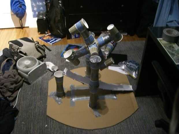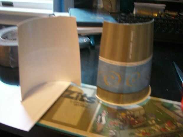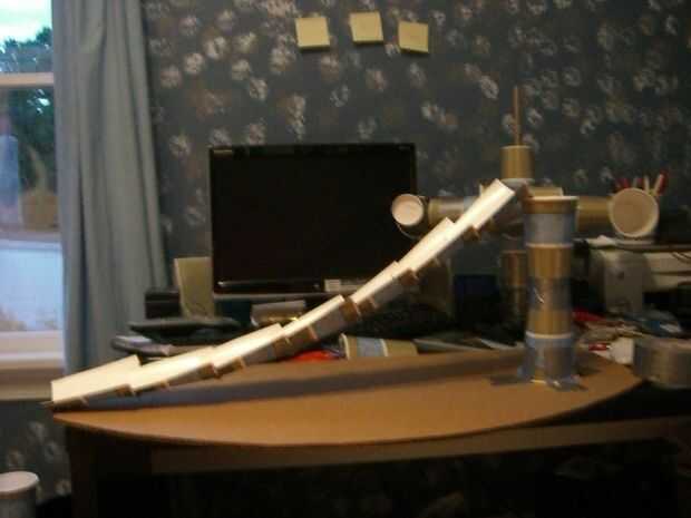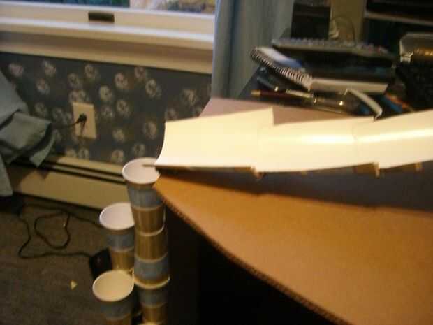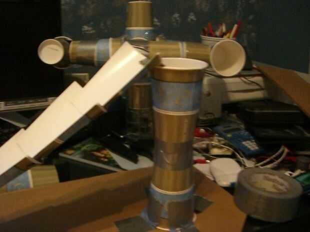 El siguiente paso es construir la base donde todo se construye sobre. se hace de cartón alrededor de 3 pies de largo y dos pies de ancho, tamaño puede variar para adaptarse a construir. los pilares de la rueda son cuatro tazas de alta, el pasador apoya ontop del cuarto pilar conducto grabado en la parte superior que mantenga mueva. la rueda gira alrededor de la espiga. corte cuatro vasos de papel por la mitad y pegarlas junto con lo más pequeños ontop de final del gran final. cinta adhesiva en la parte posterior de la taza. colocar el portaobjetos directamente debajo de la rueda de agua. cinta adhesiva la parte inferior (el lado con el extremo más pequeño) sobre el borde de la base con un trozo de lazo de cinta del conducto. Estire la diapositiva y cinta a una pequeña torre de dos tazas grabado juntos. luego pegue las tazas a la base para parecerse a la imagen. una buena idea es probar vertiendo un poco de agua en él y asegurarse de que no caiga en el lugar equivocado. Si ajusta la diapositiva así que coge toda el agua. también Compruebe que la Copa crema se queda justo cuando el agua es en él.