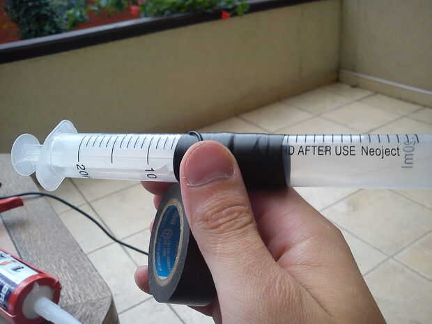 Con la cinta eléctrica Únete los extremos abiertos de los dos sirynges - el cuerpo de un sirynge sin el émbolo y el otro con el émbolo hacia abajo. Asegúrese de que usted envuelva todo bien hasta que sobre la mitad del volumen de cada sirynge.