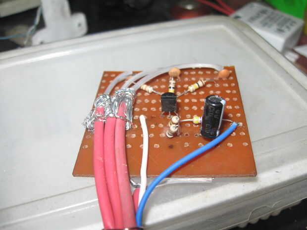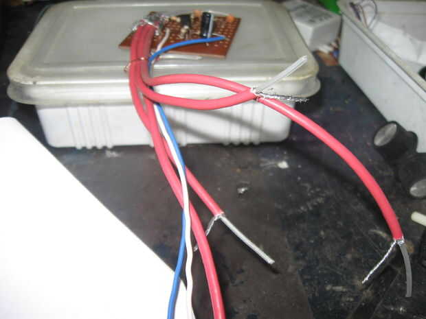 Finalmente saque los dos conduce para positivo y negativo. Aquí el positivo es el cable azul y blanco es el negativo. Los cables rojos que salen de la Junta son cables blindados como para parecer más profesional y eliminar el sonido extra lo menos posible.