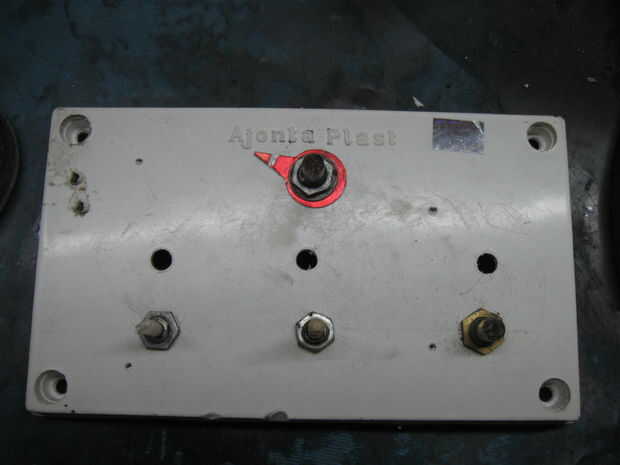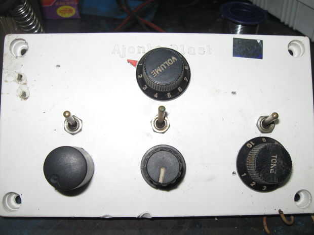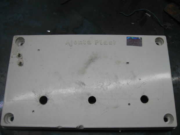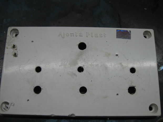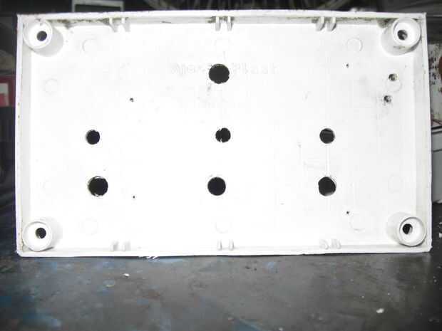 Hubo perforación más ahora para los interruptores que se insertaría para seleccionar las entradas como sea necesario. Otra vez fue perforado justo por encima de los agujeros perforados para las resistencias variables. (Cuadro 4) y en medio de los interruptores, un agujero fue perforado para el control de volumen principal.