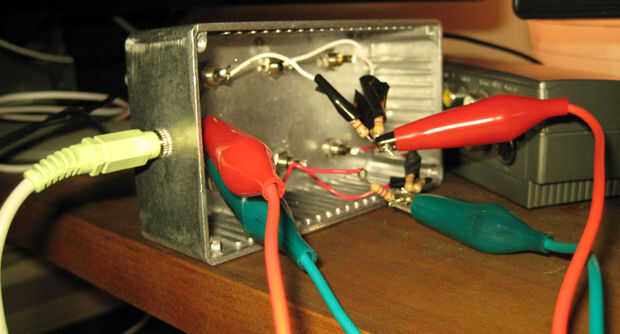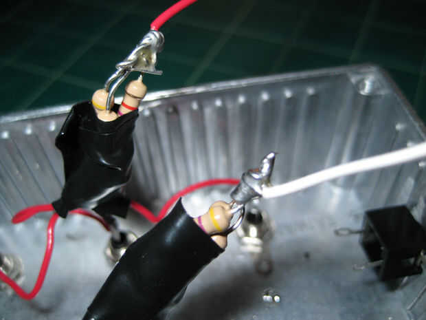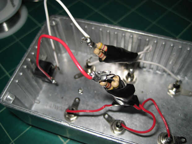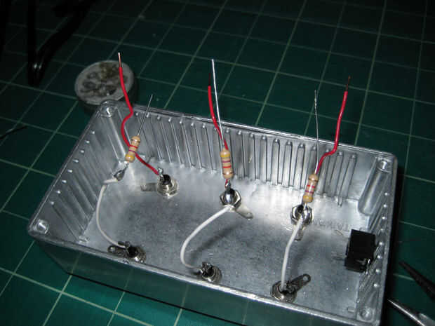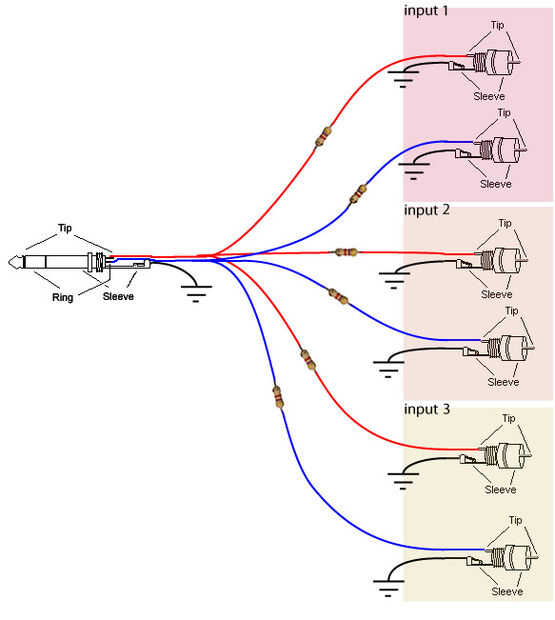 Básicamente, todas las líneas de entrada con un alambre y luego una resistencia 4.7 k conectado. Cada lado (derecho 3 todos los canales y todos los canales izquierdos 3) entonces se sueldan juntos después de las resistencias, y otro cable va desde esa conexión al polo correspondiente en la clavija estéreo de 3.5mm.