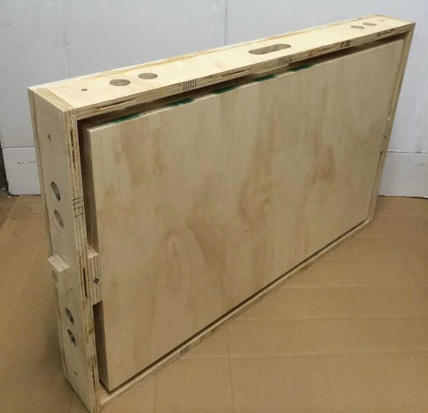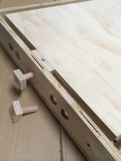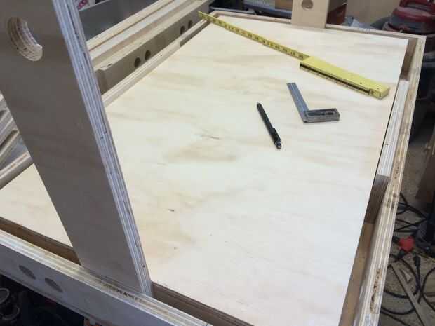 Diseño original tenía este centrado con una pieza de contrachapado en cada borde. Esto se haría mejor si se centra en el eje largo pero compensado a lo largo de la corta. La razón detrás de este cambio de diseño es para ofrecer más espacio para los dedos al usar la palanca. Poner dos piezas de madera contrachapada en un lado largo, ninguno sobre el otro.