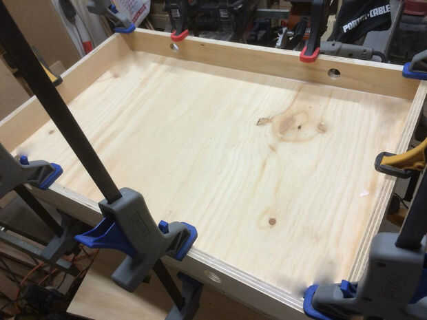 Esto debe ir bastante rápido. Utilicé galleta ensambladora. Si lo haces, recuerda marcar las tablas y los correctos ángulos de referencia. Pegamento y abrazadera o pegamento y clavos/tornillos funcionan tan bien.
