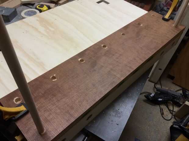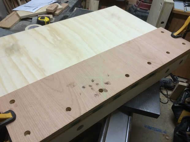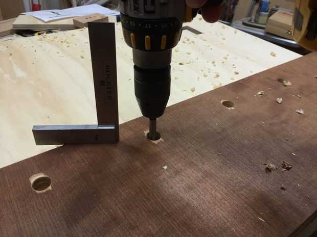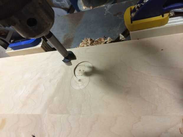 1. Trace una línea 2-1/2 todo el camino alrededor de la parte superior. De esta línea los centros de los agujeros están separados en la dirección corta de 4-3/4 y 5-5/16 en la dirección larga. A la broca. Los números son de un poco, tal vez de 1/8. Con cierta geometría lujo podría atraviesan las líneas si usted realmente desea. 3/4" fostner poco para obtener mejores resultados