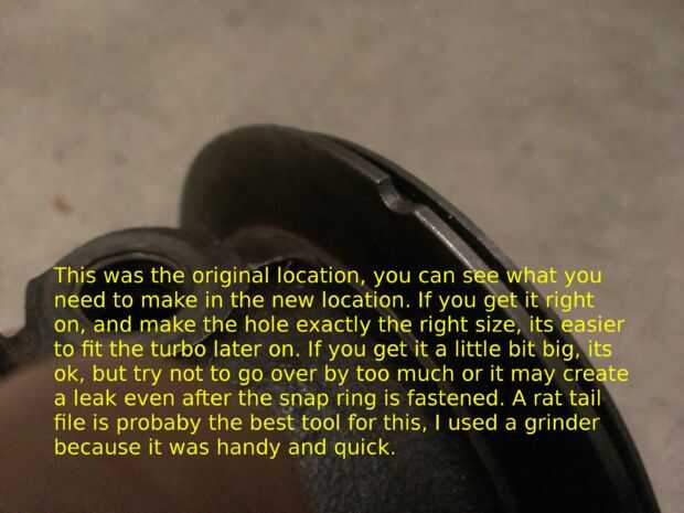 Se ha cambiado la tubería de carga en mi coche, por lo que puedo conectar nuevos turbos de estilo. Esto tomó un poco de averiguar cosas como me fui, pero era bastante sencillo. Con el turbo el coche, tomar la caja nueva y orientar la toma de la manera correcta de conectar a tu coche. Tuve que enganchar encima de algunos adaptadores, para que las cosas que conectes muy bien, a continuación, desconecte la vivienda y coloque nuevamente en el turbo con la entrada de aceite, y el desagüe, como será cuando su espalda en el coche. No cabe en el derecho, porque no hay ningún agujero para la espiga de caer, pero puedes ver donde el perno tiene un agujero y marcarlo. Ahora todo lo que tienes que hacer es presentar o moler un poco de metal donde la marca es, teniendo cuidadosa de no quitar demasiado material, pero si la clavija no encaja, eliminar un poco más material. hasta que quede plana y agradable. Ver fotos con comentarios en ellas.