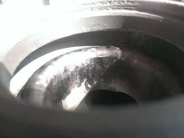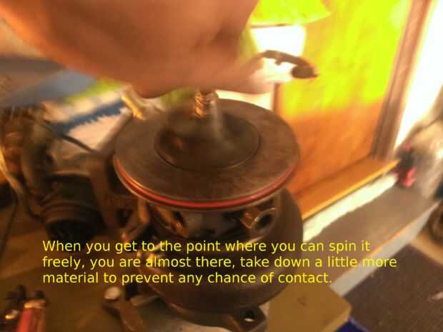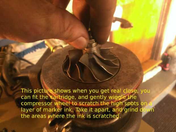 Empecé por el montaje de la carcasa en un vicio y la recolección de materiales. Comencé con una dremel, pero estaba claro que iba demasiado lento. Tengo un taladro con cable y algunos pedacitos de pulido y equipo de seguridad básico. Marqué la zona que quería retirar material y de tierra uniformemente abajo Dónde pongo el marcador. Esto sólo sacó una pequeña capa delgada y tuve que repetir el proceso muchas veces muchos, tardó un día entero de marcado y pulido. Cuando llegué cerca pude ajustar el turbo en la caja sin hacer contacto, con sólo sentado, podía girar el compresor, y le gira libremente. Marqué la zona y empujado el turbo en la vivienda hasta que hizo contacto y suavemente ondulada y dado vuelta el compresor rueda para marcar los puntos altos, y volví y les tierra abajo real bueno hasta que me pude apretar la abrazadera apretada real, luego haga girar la rueda sin que tengan ningún contacto. Para asegurar que no habría ningún problema después de que se calienta, o cojinetes de desgaste un poco, la vivienda de tierra otra pareja juegos de tinta del marcador para hacer un espacio agradable. Ver junto a la última imagen.
