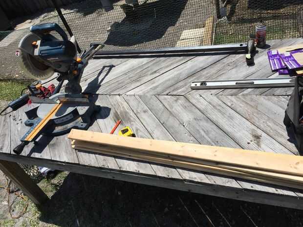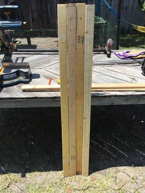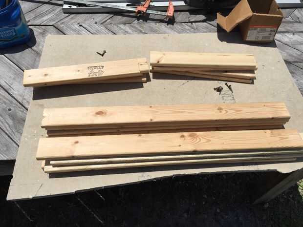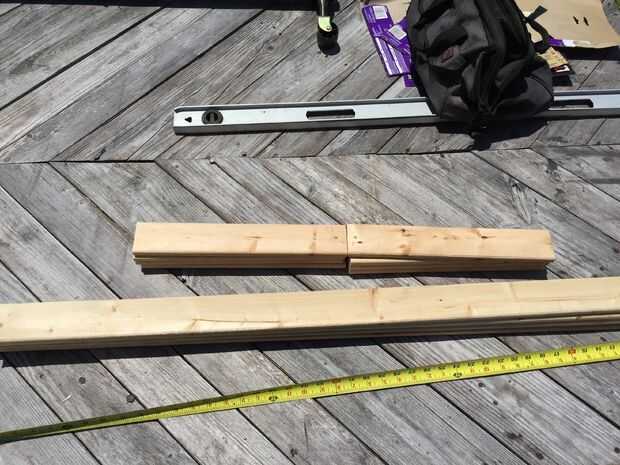 Lo mira fijamente con la caja jardinera utilizado mis listones de la 6 cama y simplemente tomé todos los listones y cortado los extremos (tenían orificios pre taladrado para el montaje a la cama) y me dio 6 longitudes en 56" y luego cortar 4 de ellos en la mitad tenía un total de 8 pedazos a 28"