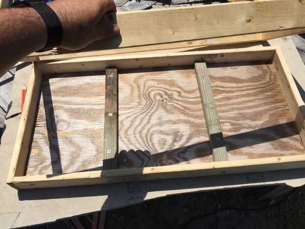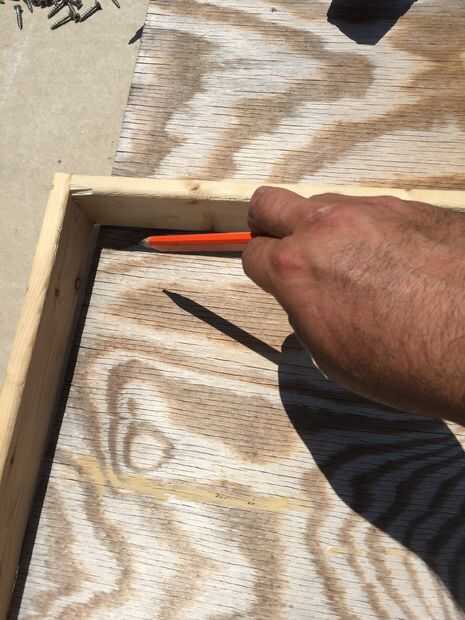 Entonces tomó uno de los marcos y colocarla sobre un trozo de madera contrachapada y trazado dentro de ella para formar la parte inferior. Después de fuera de la base de madera contrachapada puse unos tornillos en el perímetro de la madera contrachapada y poner en un par de soportes para mantener el piso en su lugar.