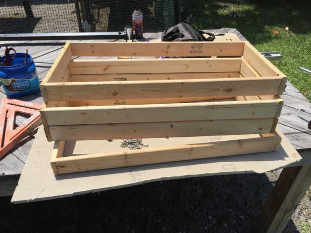 Así que desde entonces tengo una pila de 4 cajas... Simplemente se construyen cada caja estructura o nivel uno a la vez... Que ver en las fotos que estaba tratando de ser muy cuidadosos en mantener cuadrados pero al final del día sólo les atornille. Me tope las piezas largas hasta los lados y atornilladas. Hacer 4 marcos.