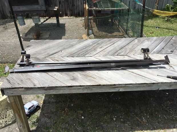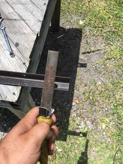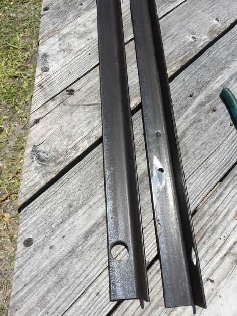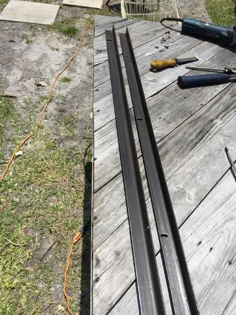 Luego con la caja levantada y nivel encontró el ángulo que me gustó mucho para las piernas de protección frontal. Una vez que lo tenía nivel y cada uno que empareja de cerca (ángulo) sujeta en su lugar y marcó el cuadro donde las piernas estaban sentados y marcan donde iba cada tornillo (necesita para marcar todo y después quitar las patas delanteras largas para preperforar las piernas del metal con un poco de metal) perforé sólo a través de la estructura metálica desde que tuve 8 negro madera pernos utiliza.