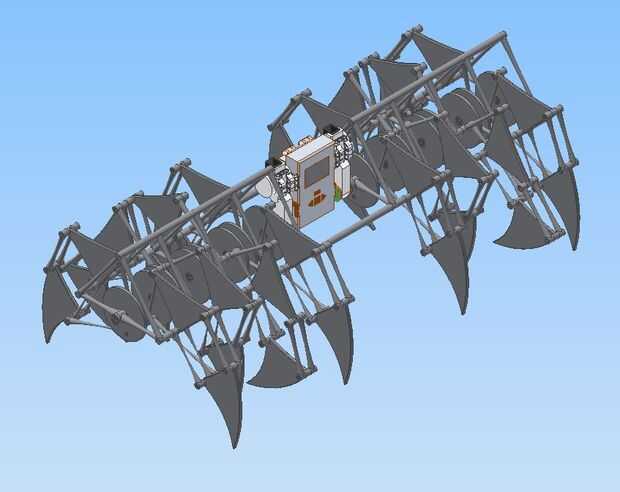 Construí este insecto caminando, inspirado en las creaciones de Theo Jansen , que utiliza un algoritmo genético para encontrar un conjunto de vínculos para formar una pierna donde el pie se mueve en un lugar conveniente para caminar. Lo que él vino p