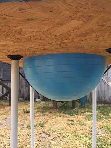 * FYI-hay una imagen que muestra una cuerda bungee alrededor de la parte inferior de la bola... Tenía miedo de poner hormigón en la parte superior y la bola deslizándose a través de... Nunca utilicé la cuerda del amortiguador auxiliar y simplemente inflar la pelota un poco más, esencialmente que la Acuña.
