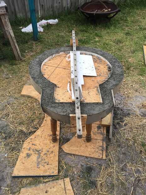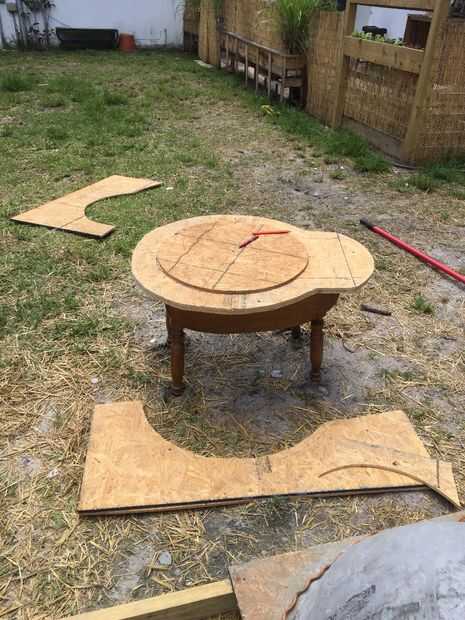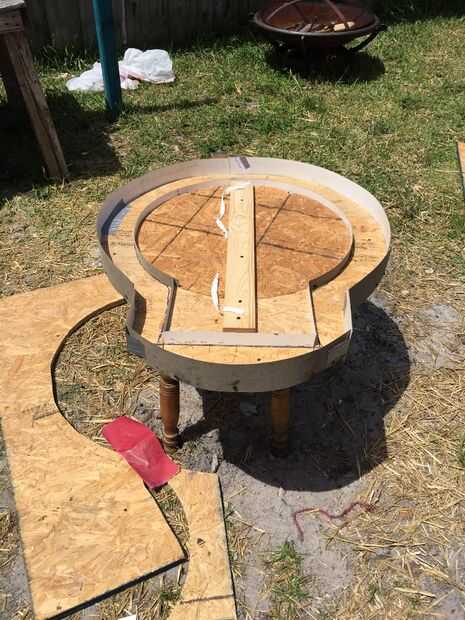 Quería un total de espesor total de 2.25 para mi piso. Así que el trazo exterior que lo hice de la (huella) de la cúpula era por abajo. Os adjunto 2,75"(2.25 para el espesor total del piso, y. 5" por lo que yo podía atornillar al borde de la plantilla de madera contrachapada) altura Recortar piezas de formica alrededor del borde entero, grapar y atornillar. Entonces tomé mi interior círculo y dentro de la plantilla de la puerta y poner un par de piezas de madera para mantener el interior del círculo en el lugar en el 1" más alto que el piso... ¿Confundido?