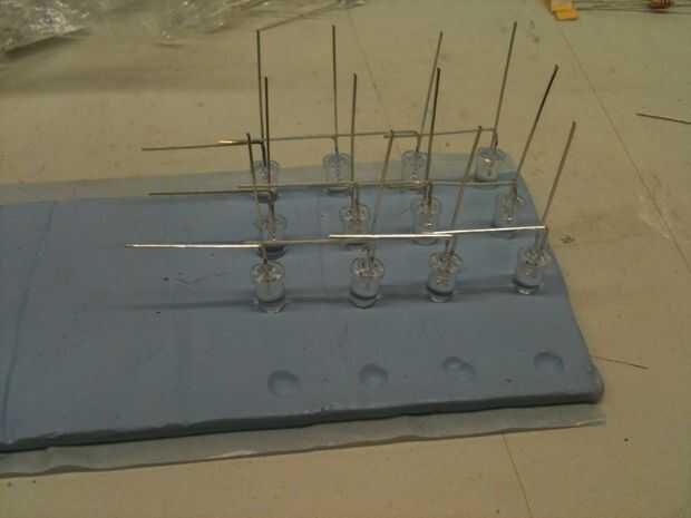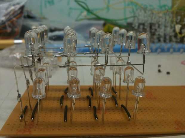 Empezar por capa por capa de soldadura. Doble el lado negativo/positivo de cada LED y unirse a ellos juntos. Coloque el LED al revés y péguelos en BlueTac para que estén en posición vertical estable. (Más fácil soldar)