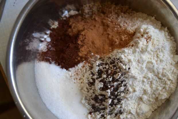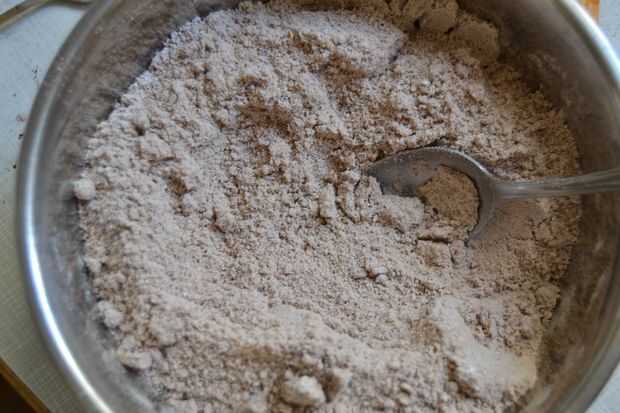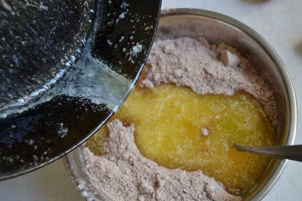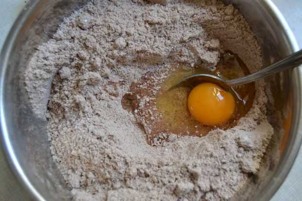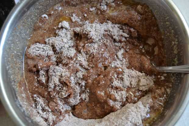 una vez que estén bien mezclados, añadir el huevo, la mantequilla derretida y 1 cucharada de kirsch. por mantener removiendo con la cuchara hasta que todo se mezcla muy bien.
