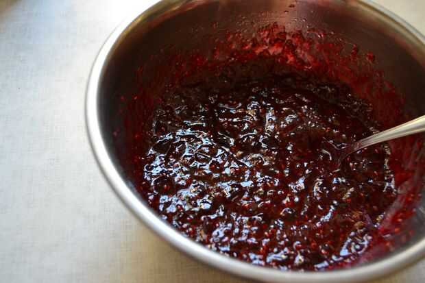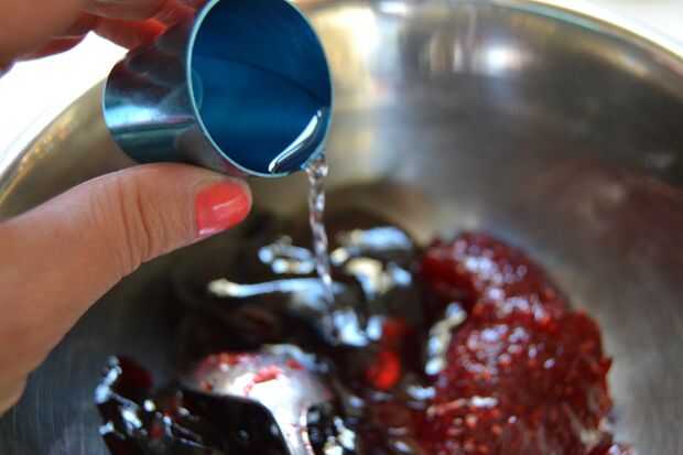 en un recipiente, mezclar la mermelada con 1 copita de kirsch.