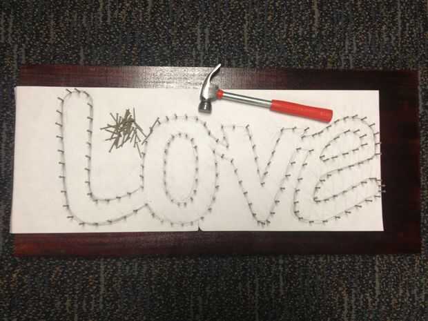 Ahora que mi logotipo de "love" es elaborado y grabado hacia abajo en el lugarlo quiero en mi pieza de madera teñida, voy a tomar mis uñas y básicamente trazar mis líneas con clavos poniéndolos sobre una media pulgada aparte. (más cerca y más lejos en algunas áreas dependiendo del ángulo)