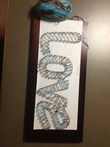 Ahora que mis uñas son golpeados en y mis líneas de logotipo de mi "amor", puedo tomar mi hilo y comenzar por hacerlo sólo el exterior se destaca completamente y también no olvide envolver bajo primero para tener habitación cuando haces la sube en zig zag entre las uñas. Cuando hice el proceso de zig zag para rellenar fui cada otro clavo y regresó a través de y entonces sólo libre estilo para tapar más agujeros. Envuelve cada clavo con un movimiento hacia la derecha.