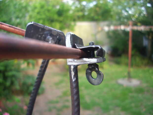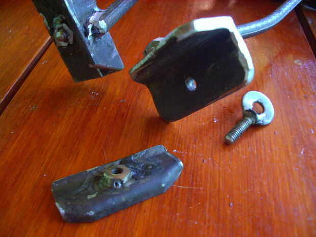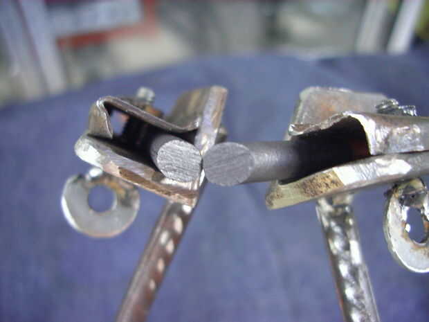Al otro extremo de cada brazo soldé una chapa gruesa con dos agujeros, para atornillarlos a los mangos de madera. Traté de los portacarbones quedaran apuntando hacia adentro y abajo en un ángulo de 45 grados aprox.