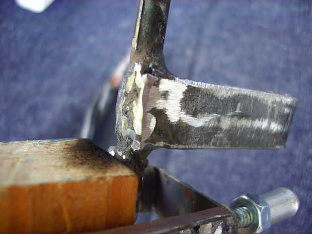 Soldado un trozo de chapa gruesa a uno de los brazos de acero, para establecer allí la pinza de masa. La hoja se dobla, para darle más grueso y mejor agarre de la soldadura.