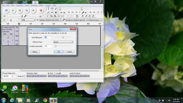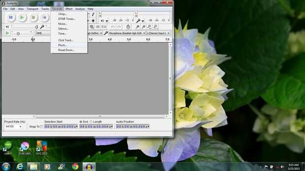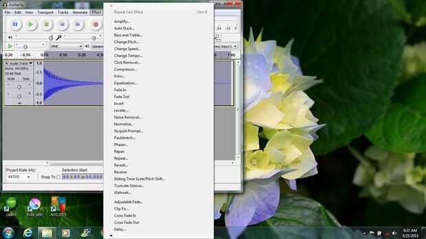 Con Audacity puede generar una muestra de sonido risset drum o puntear una guitarra. Haga clic derecho para abrir este software. Mire el encabezado superior clic en generar, luego elija arrancar. Aparece una ventana con la configuración predeterminada para este sonido. Haga clic en Aceptar. Se genera una forma de onda y si pulsa reproducir puede reproducir este sonido. Haga clic en efectos y puede seleccionar filtros que amplifican, añadir Reverb, Wah-Wah o PaulStretch. Me gusta el filtro PaulStretch porque alarga el sonido, así como dándole una calidad de otro mundo. Audacity también tiene un botón rojo para permitir una grabación en vivo del micrófono del ordenador o podría conectar una interfaz.