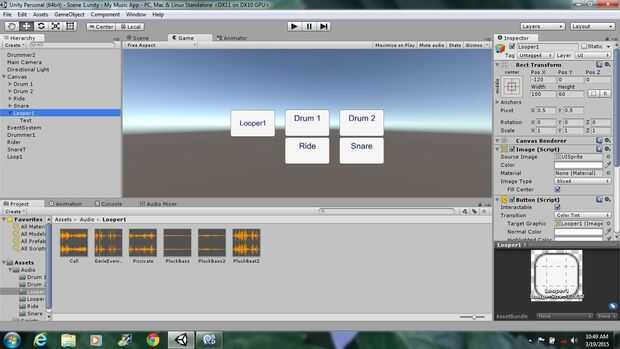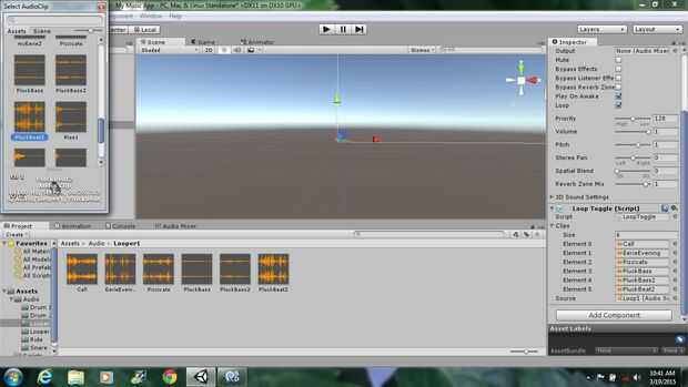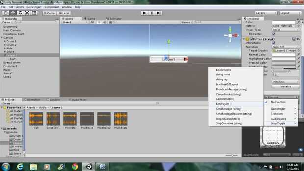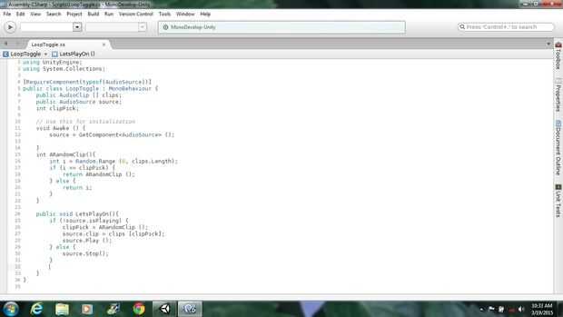 Haga clic en objeto de juego, elegir el vacío y lo Loop1. Añadir el componente fuente de Audio. En el panel de la fuente de Audio, compruebe el juego en caja de lazo. Añadir seleccione componente secuencia de comandos LoopToggle. En el cambio de panel de LoopToggle el número de clips de cómo muchos tienes y haz clic en el círculo pequeño y agregar el clip. Haga clic en círculo pequeño seleccione fuente de Audio, seleccione su propio. Haga clic en juego de objeto, haga clic en interfaz de usuario, haga clic en botón y asígnele el nombre Looper1. En Click() elegir Loop1, seleccione secuencia de comandos LoopToggle y elija su función LetsPlayOn.