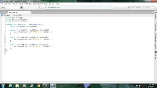 Haga clic en crear, script de C#. El nombre MusicLvls. Ábralo y siga mi screencast. Después de terminar de escribir el código haga clic en archivo, luego guardar.