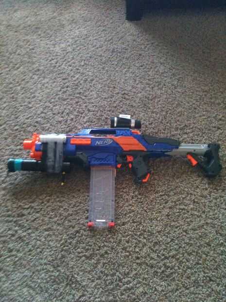Esto es rifle nerf principal uso en combate. Nuestras guerras de nerf siempre son en interiores por lo que no se necesitan armas modificadas. Esta pistola nerf tiene un alcance de acog (binocular), una linterna, un lanzador de granadas (de trabajo) y una óptica de láser/linterna. Esto puede parecer desordenado pero realmente ayuda en batalla.