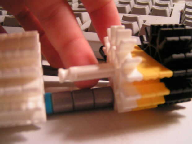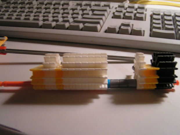 arma muy agradable que no utiliza demasiadas piezas.Pro:muy potentebastante exactacómoda manijaContras:gatillo simple bloqueel mango es un poco endeblePaso 1: El mango una manija cómoda, usted puede fácilmente construir en las fotos.Paso 2: barril se