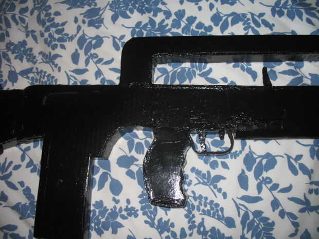 aquí es mi entrada de concurso. Es un FAMAS. Los bloques de disparo detrás de la revista dando la potencia óptima. Rango es de alrededor de 35 ~ pies. Dime lo que piensas.