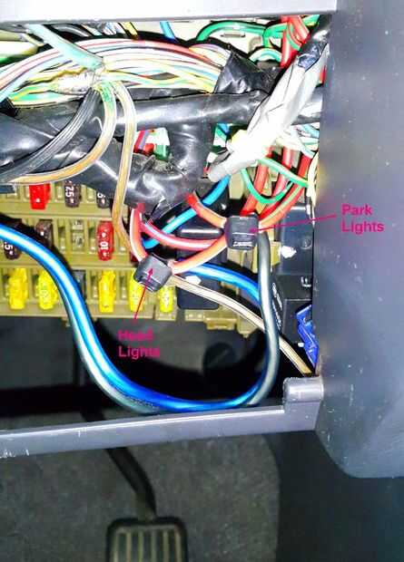 Dos relés separadas que utiliza para las luces del parque y la cabeza. La conexión real que hice junto al bajo el tablero caja de fusibles de empalmes en los cables de iluminación.
