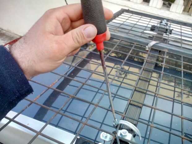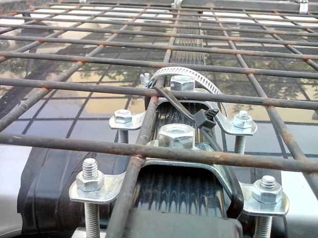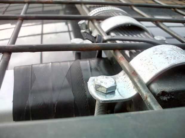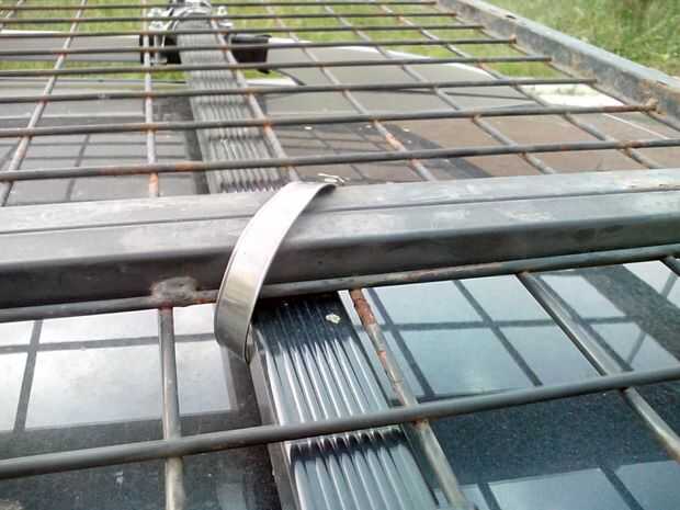 He apoyado las paredes del contenedor roll sobre la baca del portador, fijándolas con las correas de ajuste y las pinzas eléctricas.