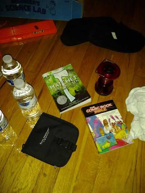 llevo Hachette por Gary Paulsen y 3 botellas de agua, la Biblia del cómic (soy cristiano), mi linterna 25 lumeb y una camiseta. sí... EH... ok, continuaremos entonces mi pueblo justo, de hecho entonces, pensé que.