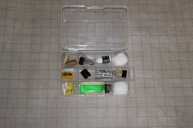 Organizador de herramienta pequeña - cordeles de yute de 10 pies, guita del sisal 10 pies, 2 clips de carpeta, 2 clips de papel, cinta scotch de 10 pies, chapstick pequeños 1, 2 bolas de algodón, 1 pie 3 cinta métrica, 5 hojas de afeitar solo borde, cinta eléctrica de 15 pies, 2 sacapuntas, 2 pegamento de uso individual (.01 oz), 1 encendedor, 25 palillos