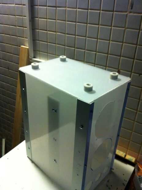 Tomé dos piezas de plexiglás, conectados uno al otro, perforar los agujeros para el soporte y atado a los lados con los perfiles de aluminio