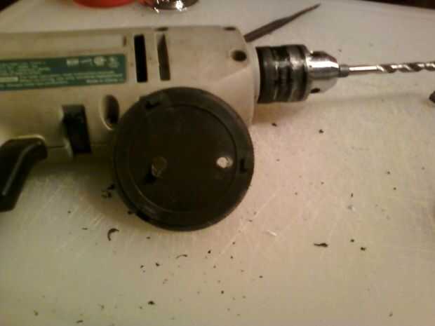 Hacer otro agujero con la broca para taladro dremel pequeño. Aproximadamente 1/8 o menor. Que tenga que comenzar pequeño y forma hasta el tamaño de la luz de trabajo. Parecen variar en tamaño. trate de colocarlo cerca de uno de los orificios de 3/8 de pulgada como se muestra en la imagen.