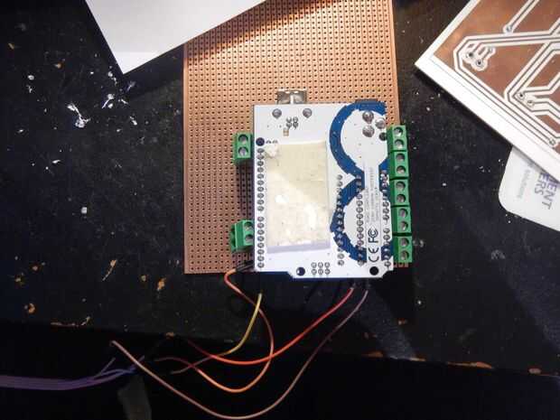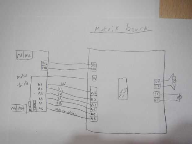 Una vez que todo esto funcionaba, hice un circuito personalizado; sin embargo no fue tan eficiente como yo quería, así que con mis supervisores hemos decidido usar un protector de motor en su lugar. La desventaja de utilizar el escudo del motor era que sólo podrían sostener hasta 4 motores y necesitaba ser capaz de controlar hasta 6 motores.
