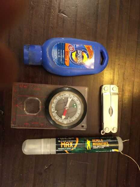 Spray protector solar y error son dos aventuras esenciales al aire libre de cualquier tipo. Mantenga que tuyo lleno! También tengo una brújula para la navegación y una pequeña multiherramienta.