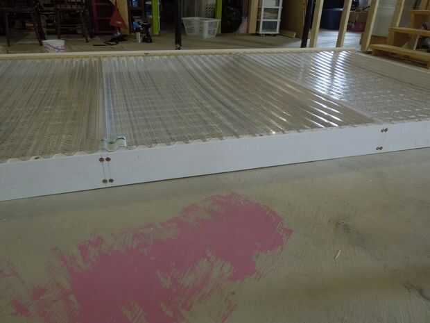 La tapa de goteo se hace de un trozo de madera de 2 por 8. Sobresale la parte delantera del marco para proporcionar un borde de goteo para evitar que el agua de lluvia penetre detrás de los cristales. Está inclinada hacia abajo de la pared por 4:12. La pendiente es proporcionada por los cortes angulares en la parte superior de cada poste exterior. En la parte posterior de la tapa de goteo arrancaron el mismo ángulo en la placa a lo largo de su longitud. Esto devuelve el borde posterior a la plomada para que puede estar plana contra la pared. La tapa de goteo sobresalga de cada lado del marco de 1.5" para una longitud total de 148,5"