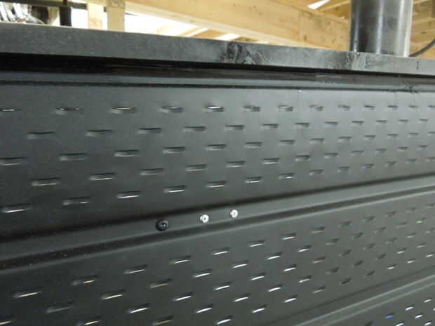 Cómo trabaja el amortiguador: Plafón de aluminio ventilado es básicamente una hoja fina de aluminio con cientos de pequeños agujeros llamados "perforaciones". Cuando el sofito está pintado de negro plano y expuesto al sol se ponen caliente. Entrada de aire del colector es en la parte delantera del amortiguador y la salida es en la parte posterior. Como el aire fluye desde la entrada a la salida se infiltre a través de las perforaciones pequeñas en el plafón y recoger calor cuando pasa a través de. Ya que el amortiguador está hecho de metal eficiente transfiere calor al aire. Este proceso se producirá o bien pasivamente a través de convección natural o podría ser ventilador forzado. Por convección pasiva ofrece la ventaja de que no requiere partes móviles, controles o electricidad de la red mientras que el aire forzado permite el colector funcionar más eficientemente.