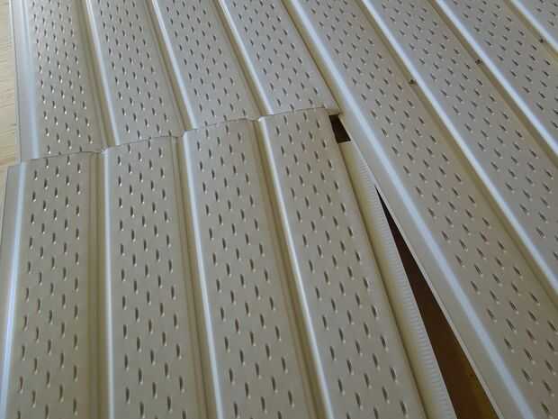Porque el marco es casi 4' de ancho y el sofito viene en longitudes de 10', cada pieza del sofito puede abarcar el marco de 2.5 veces con solo un par de pulgadas de desperdicio. Para hacer un lapso completo con las dos mitad de piezas que deben acoplarse al lado de una manera que normalmente no se hace con sofito. Con el fin de conseguir que se ajuste correctamente la ranura en la parte superior de una sola pieza debe recortarse un poco para hacer un conjunto similar al que en un pedazo de revestimiento. Las dos piezas están encajadas entre sí y se unió en el perno de centro en el marco. La última pieza del sofito a excedido el marco por unas pocas pulgadas. Fue simplemente cortada al tamaño con un par de tijeras y entonces asegurado.