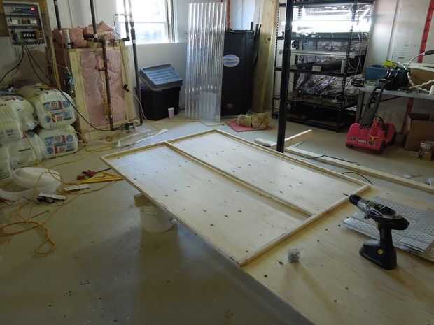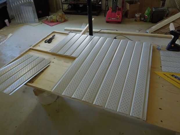 Un marco básico hecho de 3/4" por 3/4" madera de construcción similar a una pared del perno prisionero fue montado. El montante central está en el centro del marco. Os adjunto temporalmente el marco a un pedazo de madera contrachapada para mantener cuadrados mientras instalo el material de sofito. El plafón de aluminio era cortar con unas tijeras y sujetado al marco con tornillos de metal de hoja. Cada pieza del sofito enclavamientos con la anterior de la misma manera como si se instalaron en la víspera de una casa.