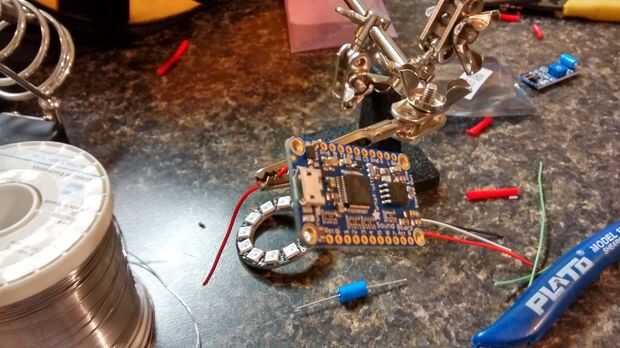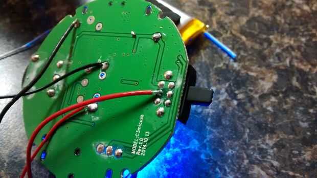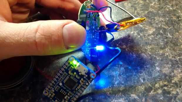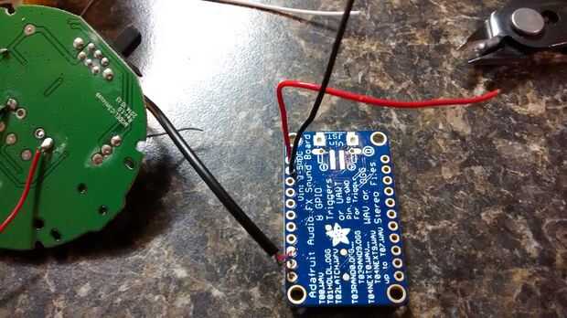 Ahora tiempo para el tablero de Adafruit FX. Corte el conector de audio de 3,5 mm del cable corto desde el centro del tablero amplificador y había conectado a los pines de salida de audio en el tablero de FX. Luego añade los cables de alimentación a la tierra de FX y pasadores de VIN. Entonces conecté el suelo a la Junta del amplificador y el cable rojo del VIN fue al punto de soldadura para el interruptor de encendido/apagado. Ahora la Junta FX fue alimentada desde el circuito del amplificador y controlada por un solo interruptor. También soldadas en cables nuevos para el altavoz y había soldado a la placa.