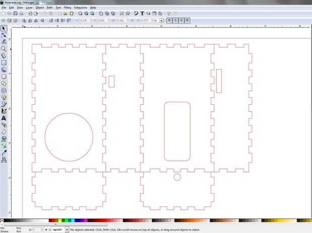 Con un cortador del Laser es una gran herramienta de las herramientas. Recurrí a esta fiel herramienta para este paso. Tenía una idea básica en mi cabeza para el cuadro. Decidí cortarlo de. 090" la hoja de acrílico que tenía. Comencé a diseñar caso utilizando makercase. Se trata de una simple caja en línea diseño de herramienta que es útil para el láser. Puse mi dimensiones en spesified mi material grueso y presiona el botón de generar planes. Esta utilidad guarda el archivo como un archivo SVG (Scalable Vector Graphics) que importa bien en inkscape, mi programa de vectores de elección debido a que es gratis. Una vez en Inkscape he añadido algunas características como altavoz agujero y corte salidas para audio jack de 3,5 mm, rueda de volumen y encendido/apagado. Entonces envió al láser y salió con una caja transparente limpia para poner las golosinas.