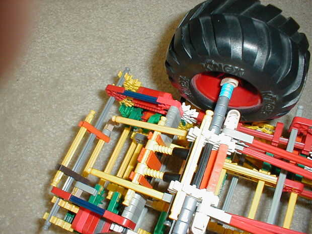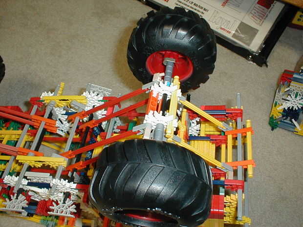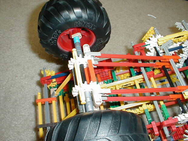 aquí se acoplarán los ejes. Las barras amarillas que van desde los ejes al chasis actúan como barras del sacudimiento, si se desconecta el el va a ser más flexible en la suspensión.